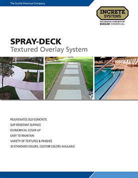 Spray-Deck is the cost-effective and easy way to create a colorful, textured surface over unattractive or dull, structurally-sound concrete without the mess and expense of full removal. This spray-on overlayment is durable and easy to maintain and has the look of brand new concrete. With unlimited color choices, Spray-Deck will restore the look of areas such as pool decks, driveways, patios, lanais, walkways, entryways, and more. At 6000 psi, Spray-Deck is resistant to abrasion and perfect for high traffic areas where a decorative finish is desired.